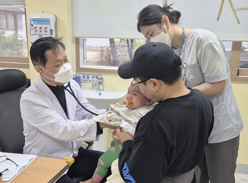 Hwang Dae Seong, Head of the Department of Pediatrics at JeongEup Asan Hospital, first from the left, is seen examining a pediatric patient.