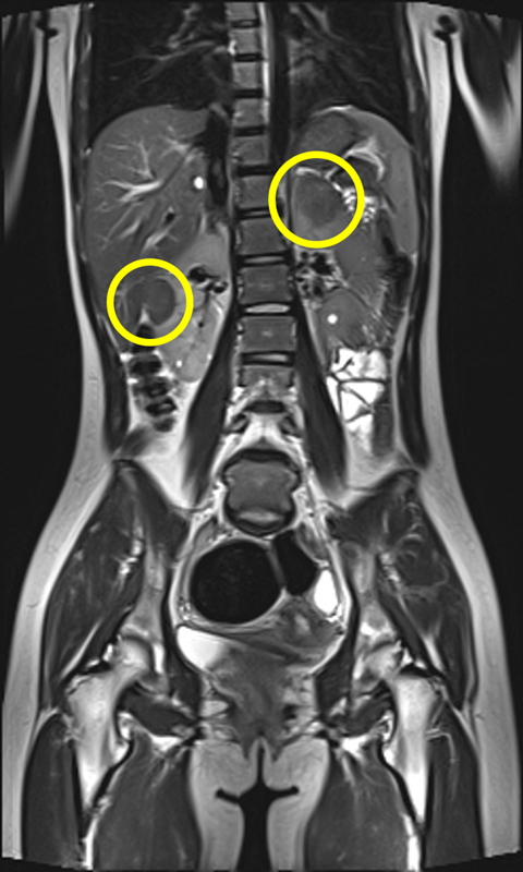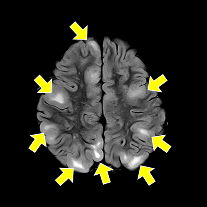 ▲ A brain MRI scan of a patient with tuberous sclerosis complex, in which benign tumors develop in multiple organs, showing multiple cortical tubers (TSC) (indicated by yellow arrows).